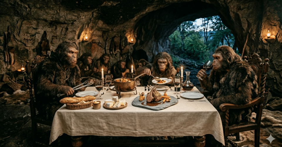 彼らは火を操り、獣を焼き、香草で味を整えていた。火は外敵から身を守り、暖を取る手段だったが、それ以上に「食材を消化しやすいエネルギーに変える」という革命を起こした。節約された消化エネルギーは脳の進化へと回され、人類をここまで押し上げた。つまり、火を通した料理こそが、僕たちの知性の源泉なのだ。